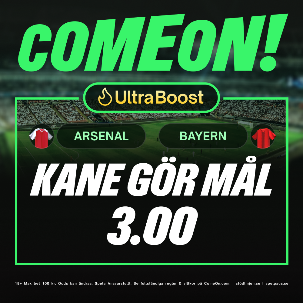 Bayern München gästar Arsenal. Harry Kane är i strålande form och öser in mål. Kamma hem en ultraboost oå Comeon.com på att engelsmannen nätar på nytt!